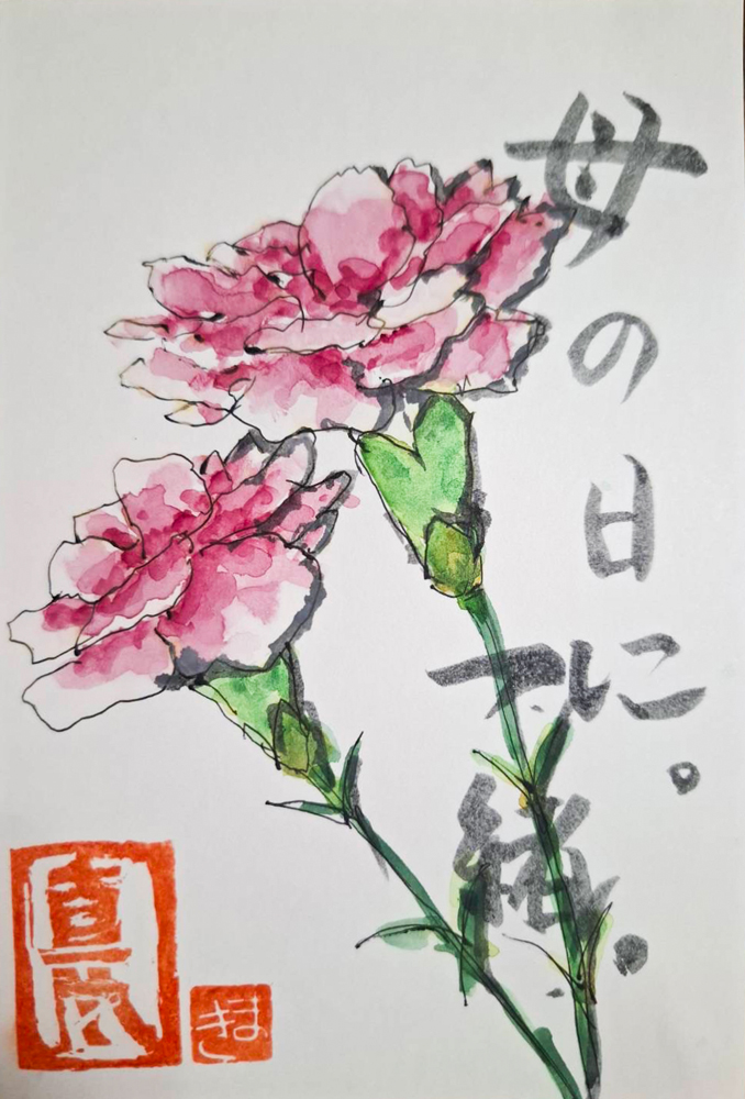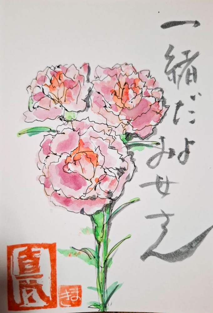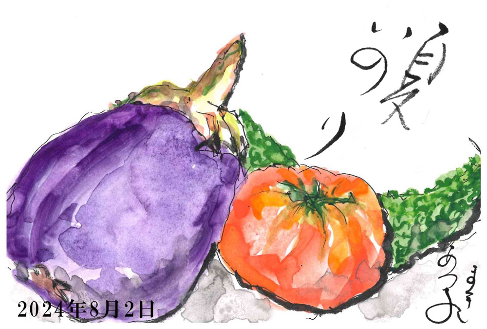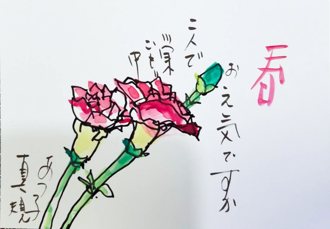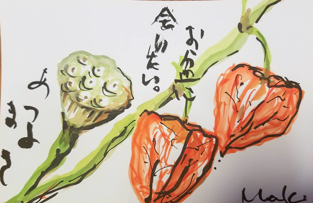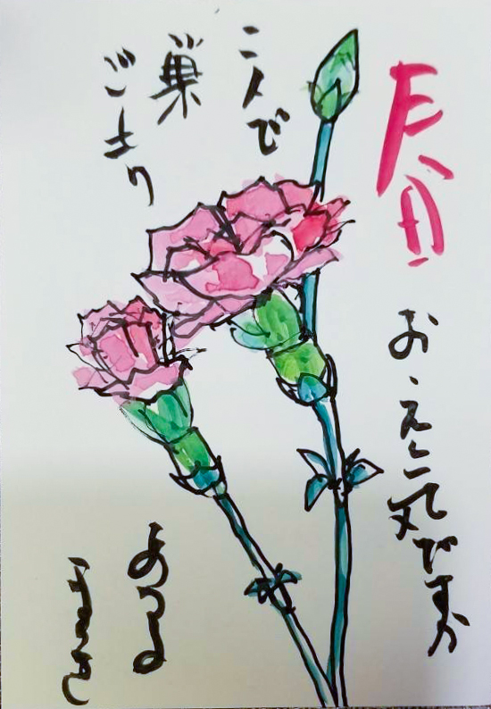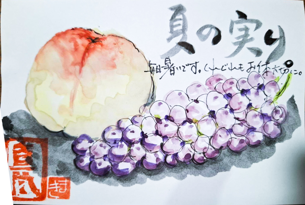 母の入院中に、母との合作で季節の花や食べ物を題材に絵手紙を描くようになりました。四季折々の草花や果物が持つ生命力を感じながら、二人で筆を走らせ色をつけて一言添えるだけですが、時間を忘れて創作に没頭するだけで、リフレッシュできる時間になります。